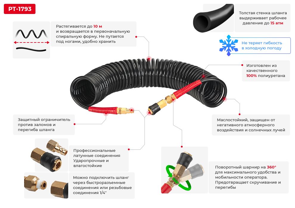 Один конец шланга оснащен вращающимся на 360 градусов шарниром для большей мобильности и максимального удобства оператора, он снимает нагрузку с рук и делает невозможным заламывание шланга. Обеспечивает стабильное соединение оборудования с источником воздуха.