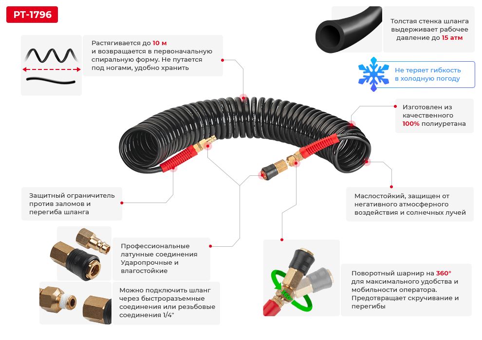 Один конец шланга оснащен вращающимся на 360 градусов шарниром для большей мобильности и максимального удобства оператора, он снимает нагрузку с рук и делает невозможным заламывание шланга. Обеспечивает стабильное соединение оборудования с источником воздуха.