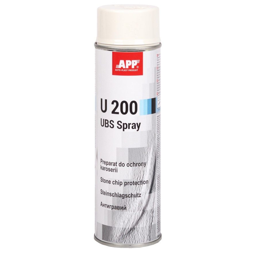 APP U200 UBS Spray призначена для захисту кузова автомобіля від дії сольового розчину, а також кислот та лугів низької концентрації. Отримане покриття із дрібною фактурою може покриватися будь-яким типом покривного лаку. Не містить бітумних продуктів та асфальту.